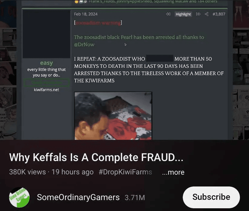 The Kiwi Farms situation is where it gets a little more complicated. Zoosadists have been long the target of investigation by independent users of The Kiwi Farms. Phillip, above, has learned he can tap into the industrial media complex and Wikipedia to level wild accusations against the people who use that site who have exposed numerous zoosadists. They are expert at cherry picking, and choose not to engage with the fact so many of the claims made against the forum have been debunked, along with popular Youtuber SomeOrdinaryGamers citing the primate zoosadism thread as an example of why the site should stay online, to 1.5 million people no less;