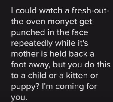 Whilst I do not take any moral outrage expressed by zoosadists seriously (it is always performative), I will take the above comment at face value and pretend like he really does dislike puppy torture. Perhaps puppy zoosadists feel the same way about him, and they’re coming for the monkey zoosadists. I take this subject seriously, but I’m not going to make any effort to downplay when things become absurd. And this is one of those times. A grown adult went on the Internet to talk about wanting to punch new born baby monkeys, and for some reason felt the need to balance it out with a reference to not liking people who punch puppies…because come on, too far.