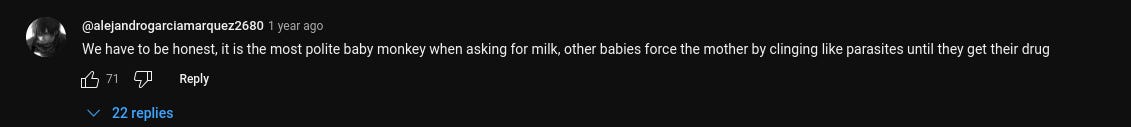 I do not believe anyone goes from zero to seeking out videos of baby monkeys breastfeeding and becoming emotionally attached to those videos. We can only speculate what motivates this behaviour, but the women who engage in it are overwhelmingly Mothers. Women, who have had access to children, projecting the qualities of human children onto infant macaques, whilst openly indulging torture fantasies, should be a cause for concern. It is not normal behaviour, even by criminal standards. It is not even enough to call it perversion, which may imply some deviation from the norm that doesn’t really effect anyone else. Sadistic perversion is not a common phenomena, being able to see what it looks like unchecked and unregulated has been horrifying and fascinating experience.