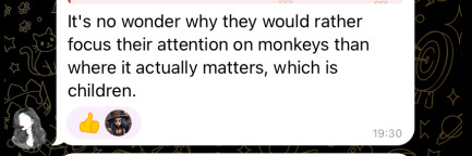 I am of the belief that her responsibilities and being a Mother should be of such importance to her that she won’t put it all on the line for videos of baby monkeys dressed as toddlers being raped. Sadly, the zoosadism community on Telegram have approached it from a different angle, and they take the things they stand to lose and use them to justify their continued zoosadism activity.