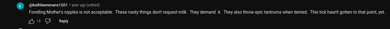 For context, I had to look for these quotes as examples of the primate zoosadists bizarre fascination with breastfeeding. It took all of fifteen seconds. These weirdos are all over the ‘community’. This behaviour and this particular fantasy is extremely prominent and not the domain of outliers. It is in no way an anomaly. Breastfeeding and milk as a theme is an absolutely central feature of so called ‘monkey hate’. It is popular with both male and female primate zoosadists. It is worth noting that this behaviour, whilst apparent on Telegram, is far more frequently seen on YouTube. Simply put, Telegram has a greater focus on torture and rape, whilst content on YouTube is more suggestive and requires the viewers to fantasies and roleplay in the comments section. That being said, groups can be found on Telegram called ‘milk bar’ as a nod to this particular fantasy.